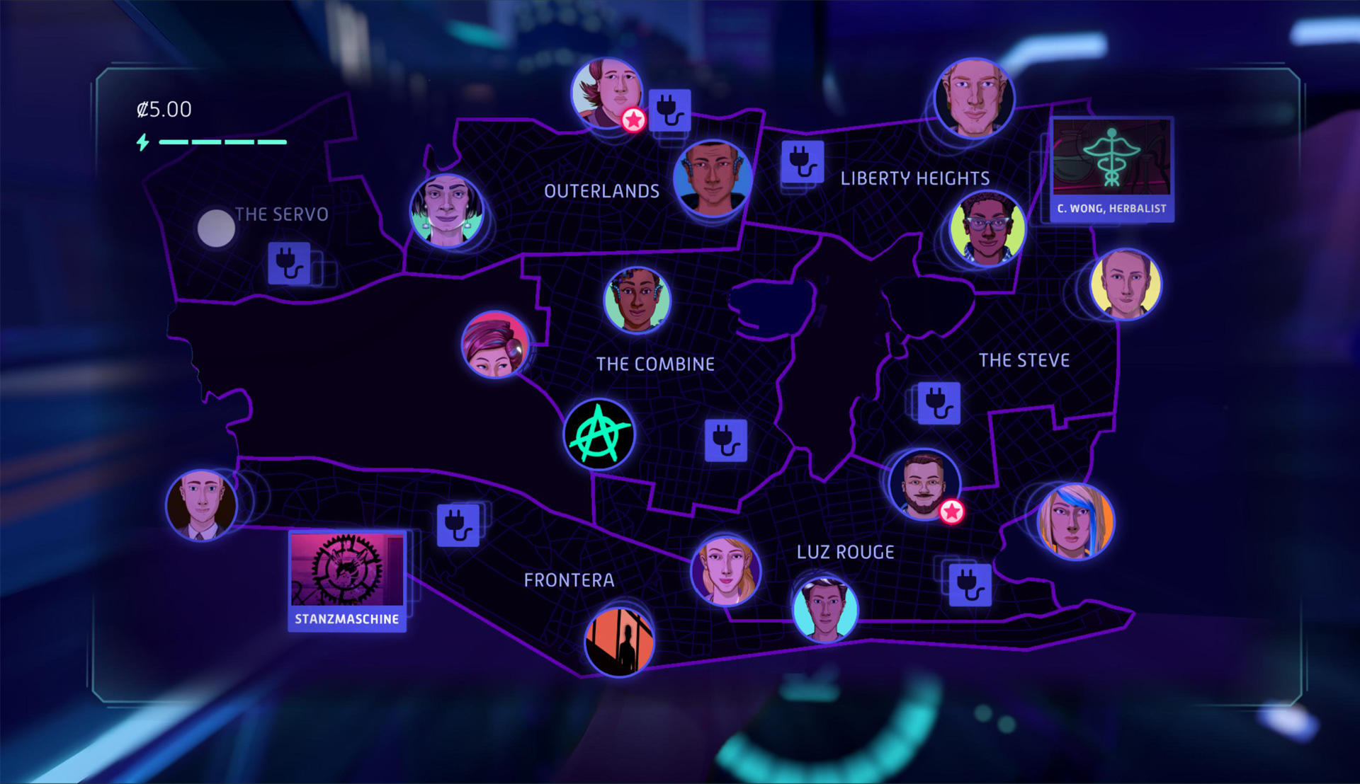 Navigate the neon-drenched streets of Los Ojos from the Neo Cab map. Choose your passengers— and your words— wisely. You’ll need to balance your cash, star rating and emotional health to survive in this town.